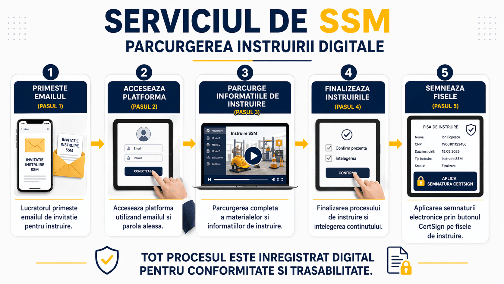 Platforma noastra de servicii SSM si PSI simplifica fluxul de ssm digital pentru firme. Instruirea, semnarea si arhivarea se fac in acelasi loc, iar fiecare pas ramane trasabil, util la controale ITM sau ISU. Mai jos ai procedura completa, in 6 pasi.